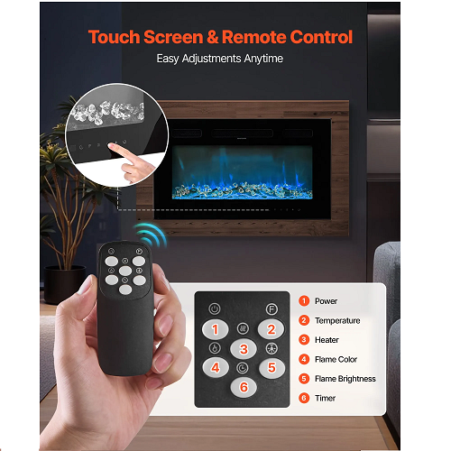 Easily adjust flame color, brightness, and heat with the touch screen or the included remote control. A built-in timer allows automatic shutoff between 1–8 hours in 1-hour increments, providing safety and energy savings.