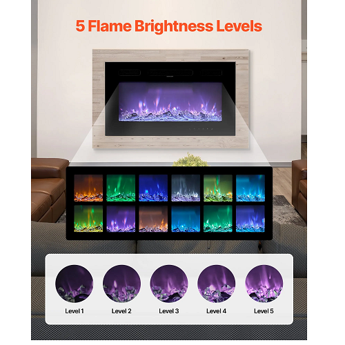 This electric fireplace features tall, vivid flames enhanced by a sleek flat tempered glass panel for a lifelike appearance. Decorative logs and crystals add a cozy touch, recreating the warmth and charm of a traditional fireplace in a modern design.