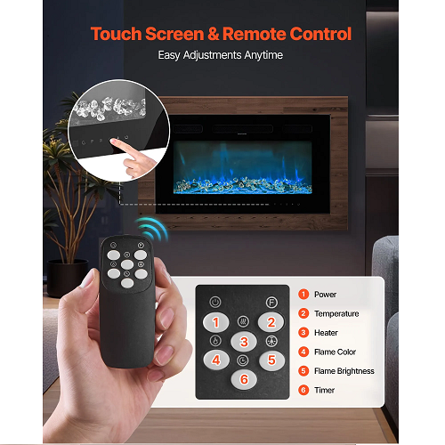 Easily control flame color, brightness, and heat using the built-in touch screen or the included remote control. A programmable timer allows automatic shutoff between 1–8 hours in 1-hour increments, saving energy with ease and safety.