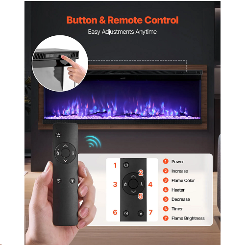 Easily adjust flame color, brightness, and heat using the built-in touch buttons or the included remote control. A programmable 1–8 hour timer allows automatic shutoff in 1-hour increments, saving energy and offering peace of mind.