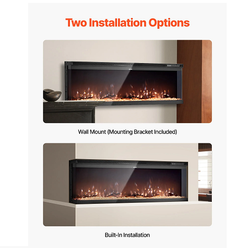 Designed for both wall-mounted and recessed installation, this versatile fireplace fits seamlessly into any room. A detailed user manual and installation guide are included for quick and easy setup.