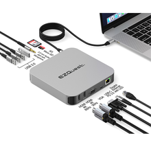 The EZQuest Ultimate Plus Dual HDMI USB-C Multimedia Hub Adapter comes with the latest USB-C Power Delivery version 3.0 with pass-thru charging up to 100 watts (20V/5A) for quickest and safest charging and FRS technology. The high speed Gigabit ethernet lets you have uninterrupted internet or network connection with LED indicator that shows the connection status. Also it features simultaneous read and write SDHC or Micro SDHC card readers. Four USB-A 3.0 ports allows for 5Gb/s data transfer rate on each port while connecting to charge or sync your smart devices thru the USB-A ports. This hub is also equipped with a 3.5mm Audio Jack/Microphone ( 2 in 1) to connect wired external audio devices. Our audio jack won't disable any internal speaker on your computer unless an audio device is connected. The EZQuest Ultimate Plus Dual HDMI USB-C Multimedia Hub Adapter comes with a one meter nylon braided USB-C cable so you have the ability to set up your hub on your desk any way you like.