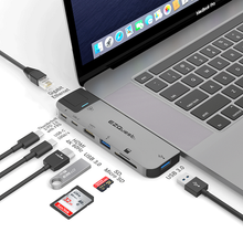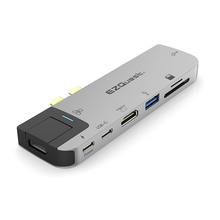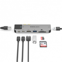 The EZQuest USB-C Multimedia Hub 4K 60Hz Adapter is designed for MacBook Air and MacBook Pro so you can connect to an HDMI display to extend or mirror the computer's display screen, while also connecting up to two standard USB 3.0 devices. The Thunderbolt 3 port on this hub provides the latest Power Delivery version 3.0 with pass-thru charging up to 100 watts (20V/5A) for quickest and safest charging. High speed Gigabit Ethernet lets you have uninterrupted internet or network connection. Also it features simultaneous read and write SDHC or Micro SDHC card reader. Stream movies in full HDMI 4K 60Hz, stay connected with your Gigabit Ethernet line directly to the internet or your network for high performance, sustained, and secure connection. Charge your iOS devices, access your standard USB, SDHC and SDHC Micro storage devices.