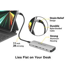 • Extended 11 inch (28cm) cable allows hub to lie flat on desk when connected to any tablet or computer equipped with USB-C port