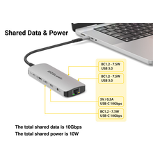 • Power Output: 2 x USB-C Gen 2 (10Gbps) ports, 1 with BC1.2 (5V/1.5A-7.5W), 2nd one 5V/0.5A (2.5W) power output, 2 x USB-A 3.0 ports BC1.2 each output 5V/1.5A (7.5W). When using all the ports simultaneously to power your devices, the total shared power is 10 Watts