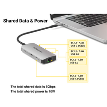 Power Output: 2 x USB-C 5Gbps ports with BC1.2 each outputs 5V/1.5A (7.5W), 2 x USB-A 3.0 ports BC1.2 each outputs 5V/1.5A (7.5W). When using all the ports simultaneously to power your devices, the total shared power is 10 Watts