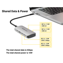 Power Output: 2 x USB-C 5Gbps ports with BC1.2 each outputs 5V/1.5A (7.5W), 2 x USB-A 3.0 ports BC1.2 each outputs 5V/1.5A (7.5W). When using all the ports simultaneously to power your devices, the total shared power is 10 Watts