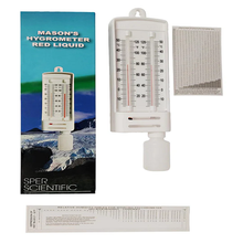 One thermometer bulb is kept constantly wet by a siphon reservoir while the other gives a dry temperature reading. Humidity is obtained by comparing the two readings on the enclosed chart. The red liquid masons hygrometer uses a safe and easy to read red liquid in place of the usual mercury. Dual scales of -10/50°C and 10/120°F.