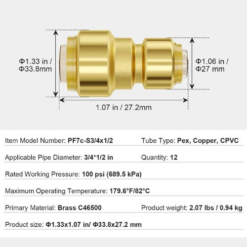 Professional Safety: This set of pipe fittings includes 12 push-fit straight connectors and 2 pipe pullers, all meeting the same standards for commercial and residential plumbing applications. Each fitting can withstand pressures of up to 100 PSI and temperatures of 82°C/179.6°F.