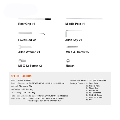 Rake Head Size | 36.02" x 3.94" x 1.38" |