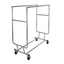 • Made of 1" round tubing. 48" double hangrail each with two (2) 12" pull-out rods. Height adjusts at 55", 60" and 65". Contains 4" ball bearing casters with protective rubber bumpers included. Collapsible.