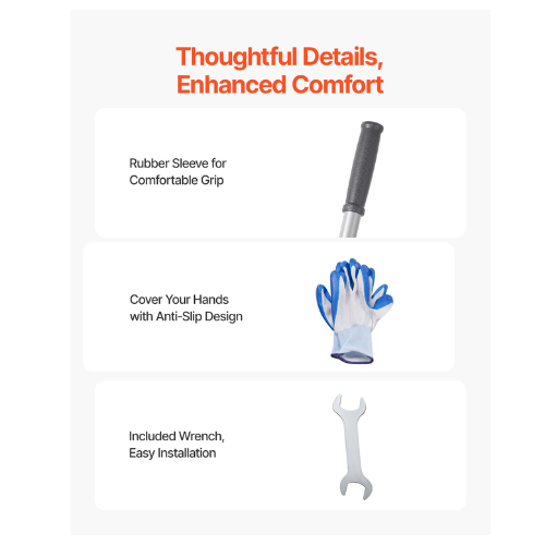 ✅ Quick & Easy Assembly – Includes an instruction manual, gloves, and a wrench for hassle-free setup. Simply align and tighten the handle threads, then secure the base and plate with bolts.