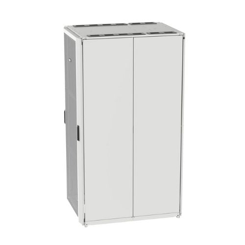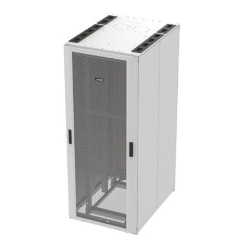 • The Net-Access™ N-Type Cabinet is a 48 RU enclosure with dimensions of 88.5" H x 31.5" W x 48" D. It features an 800mm W x 1200mm D cabinet with a top panel. The cabinet includes a dual-hinge perforated front door that can open to the left or right, and a rear door with split perforation for improved ventilation. It comes equipped with two solid side panels, two sets of cage nut equipment mounting rails, and 48 RU of cable management on both the front and rear of the front posts. The cabinet is finished in white.