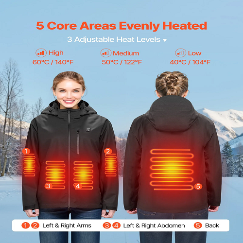 This heated jacket features carbon fiber heating elements across 5 core zones (arms, abdomen, back), providing rapid warmth with 3 adjustable heat settings (low/medium/high) ranging from 104-140℉. Perfect for cold winter days.
