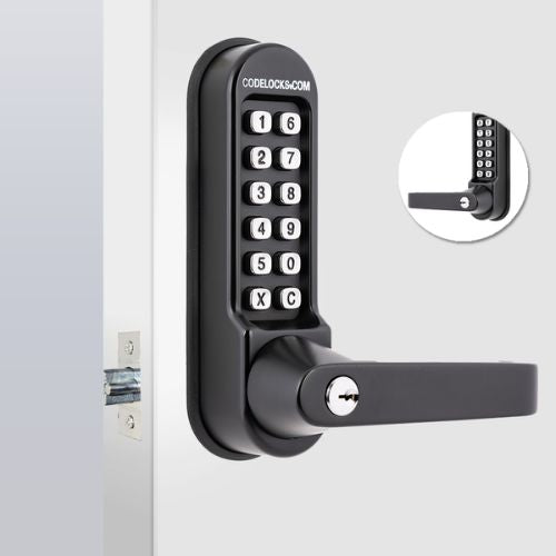 Marine heavy-duty mechanical lock with latch and redesigned lever handle. With key override and code-free option. Medium-duty tubular latch. Two coded plates for installation on both sides of the door. Provides coded access in both directions. The outside lever will retract the latch freely until disabled.