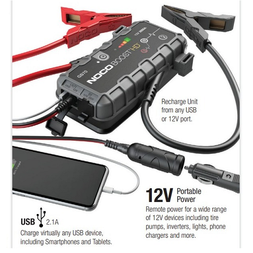 The GB70 is a portable lithium-ion battery jump starter pack that delivers 2,000-amps for jump starting a dead battery in seconds. It features a patented safety technology that provides spark-proof connections and reverse polarity protection making safe and easy for anyone to use. It's a powerful battery booster that doubles as a portable power source for recharging USB devices, like a smartphone, tablet and more, or powering 12-volt devices, like a tire inflator, power inverter and much more. Designed for a car, boat, RV, truck and more with gas engines up to 8 liters, and diesel engines up to 6 liters.