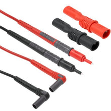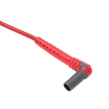 The ATL57 is a replacement test lead set with right-angle connections, silicone insulation, and an overall length of 48 inches. Each set includes threaded alligator clips for hands-free testing and a pair of test lead protective cap shields to reduce the exposed tip length during CAT IV testing. These leads are UL listed and safety rated at CAT IV 600V 10A / CAT III 1000V (with protective cap shields), and CAT II 1000V 10A (without the protective cap shields). Silicone insulation offers greater flexibility in both hot and cold weather without cracking while also being much more burn and solvent resistant than standard insulation. The ATL57 will fit into most industry standard meters with 4mm input jacks. The lead ends are right-angle shrouded banana clips with a shroud length of 17mm.