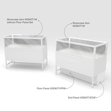 • The end panel finished in white easily mounts to the square tubing base of the Glass Showcase Display Cabinet with Storage (DDKIT1W). Showcases can use two end panels if needed, usually you only need them for one end of the last showcase in a run of showcases. It works on either the left side or right side of the showcase.