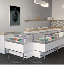 • The front panel in a white finish easily mounts to the base of the Glass Showcase Display Cabinet with Storage (DDKIT1W). Use one front panel per showcase. Use for when you want to close off the space under the showcase. Makes the showcase look like it goes all the way to the floor.