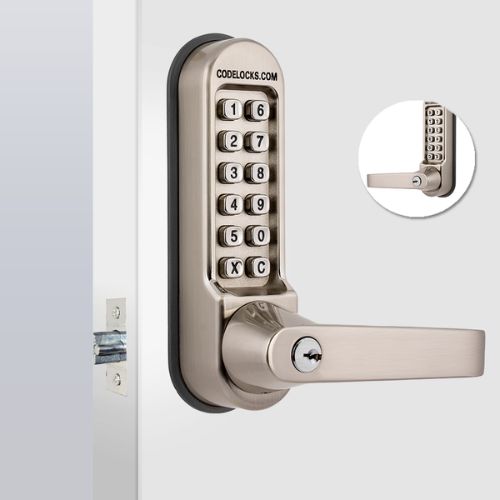 Stainless steel Heavy-duty mechanical lock with tubular latch and redesigned lever handle. With key override and code-free option. Medium-duty tubular latch with key override and ‘anti-shim’ plunger. The latch retracts by turning the inside handle freely or the outside handle after code input. The outside lever will retract the latch freely until disabled.